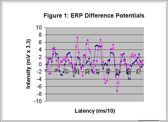 A previous study (Germine, 2000) used a silent or absent odd stimulus, and also showed significantly replicable alpha periodic difference potentials. Although the statistical results of the present study were at least two orders of magnitude more significant using linear regression of 76 voltage values at 10 ms intervals between zero and 750 ms latency, a less conservative statistical analysis was conducted in the former study (Germine, 2000). The former studies employed average voltages of 3 ms intervals as a variable, and yielded a significance level between voltage values of difference potentials of p < 10-21. This statistical method was criticized on the basis of the supposition that autocorrelation may have been a factor in the statistical results, and therefore a more conservation statistical method was adopted. Using the more conservative statistical method of this study, the difference potentials of the former study were significantly correlated within the study, but not significantly correlated with the potentials generated for this study. This is attributed to the differences in the experimental conditions.