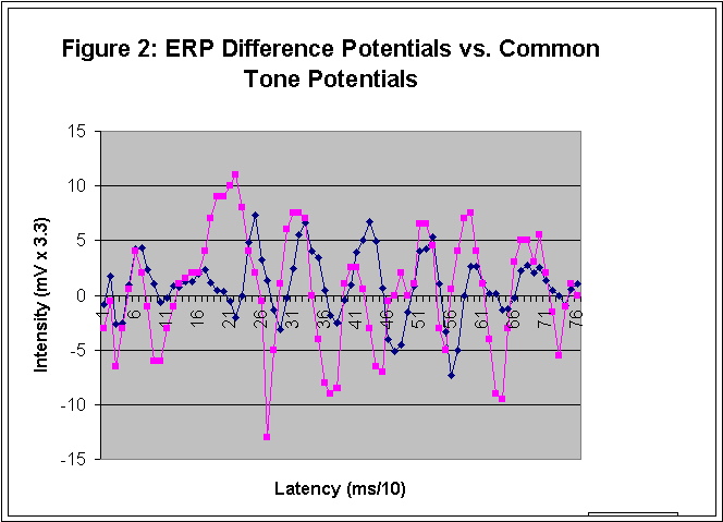 An average of 104 tones was recorded yielding four profiles. On the basis of these four profiles, two difference profiles were generated. Both show a strong periodicity in the alpha range, at about 11 Hz. On linear regression, using voltage at each of 76 time points at 10 ms intervals as a variable, the two difference profiles were positively correlated at F = 22.4; p = 0.000011, showing that there was a highly significant and reproducible difference between the inactive and active data. Single factor ANOVA showed that that two difference profiles were not statistically different at a level of p = 0.67 (with p < 0.05 being significantly different). The graphical data are shown in Figure 1.